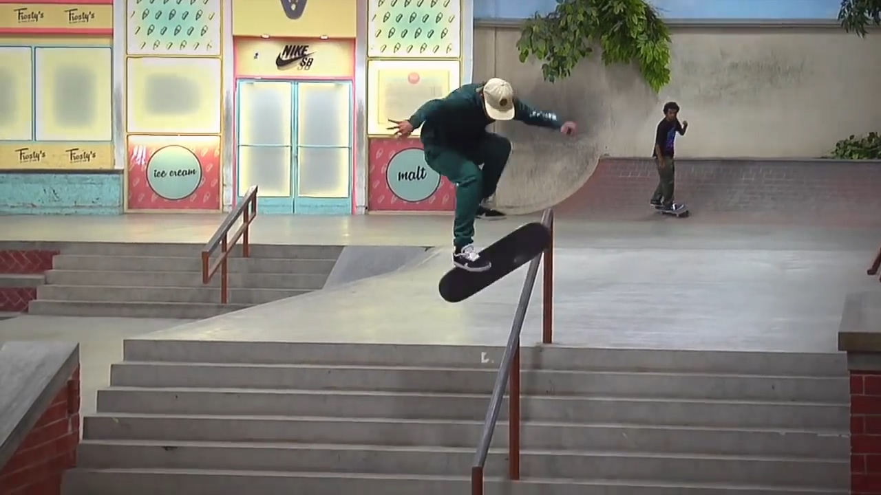 Gustavo Ribeiro 扭伤了左脚,带伤 Tre Flip Lipslide 了 The Berrics 所有杆子,落地之后的他摇摇头,动作成功的喜悦还不如脚的痛苦来得多。