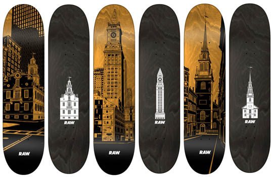 来自美国东岸Boston地区的滑板店铺Raw联合艺术家Jonah Miller共同推出了一组以Boston本地历史地标建筑为主打