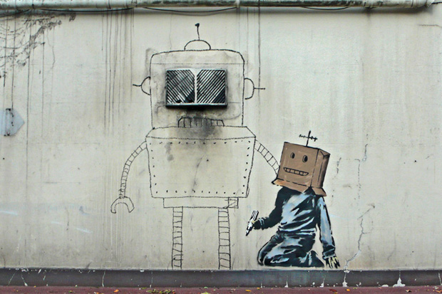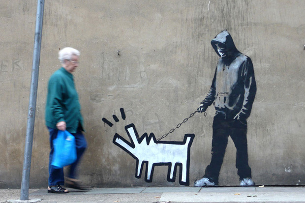 英国街头涂鸦艺术家Banksy在伦敦街头的新作遭到曝光:3组作品分别效仿了已故艺术家Keith Harring笔下的小狗,动画片Futurama里的机器人Bender,以及摇滚乐队The Clash在London Calling专辑封面中怒摔吉他一幕