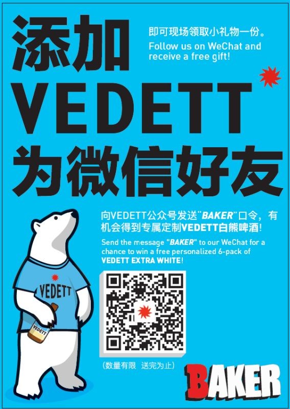 Our official beer sponsor VEDETT prepared a special surprise to our fans. On the day of the Baker 3 Premiere, simply send the message “Baker” to VEDETT’s WeChat account to receive a password and exchange a free gift. You’ll also have the opportunity to win your own 6-pack of personalized VEDETT Extra White. All you need to do is send a photo of you with a VEDETT to VEDETT’s WeChat account (don’t forget to include your contact information)!