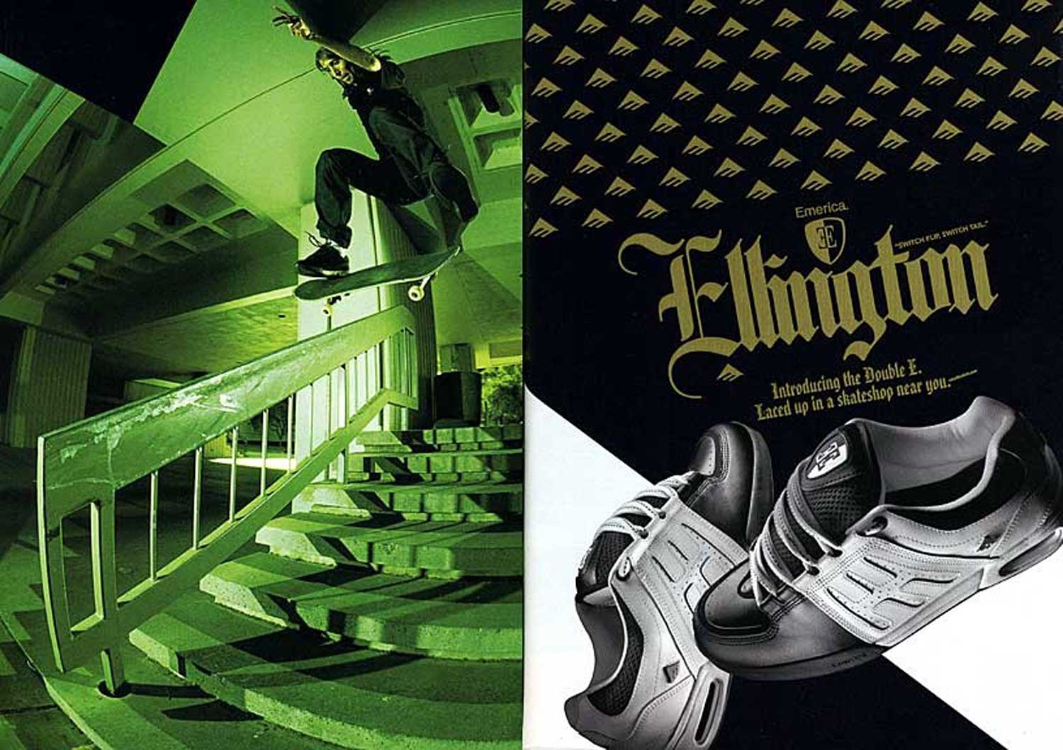 Emerica 的产品有着最纯粹滑板鞋的美誉。Erik Ellington 的签名款脱胎于 Emerica 的老鞋型 “Mark Johnson”。这该鞋外面由厚实的翻毛皮制成,而中底也运用了当时颇为高端的 EVA 填充。Ellington 成名前曾说,自己如果有机会出签名鞋,一定要用最独特的配色。在 03 年 Emerica 的《This is Skateboarding》中,这双鞋的首次出镜的确让滑手们知道 Ellington 不是说着玩的,大胆的造型和配色让它销量一直居高不下。