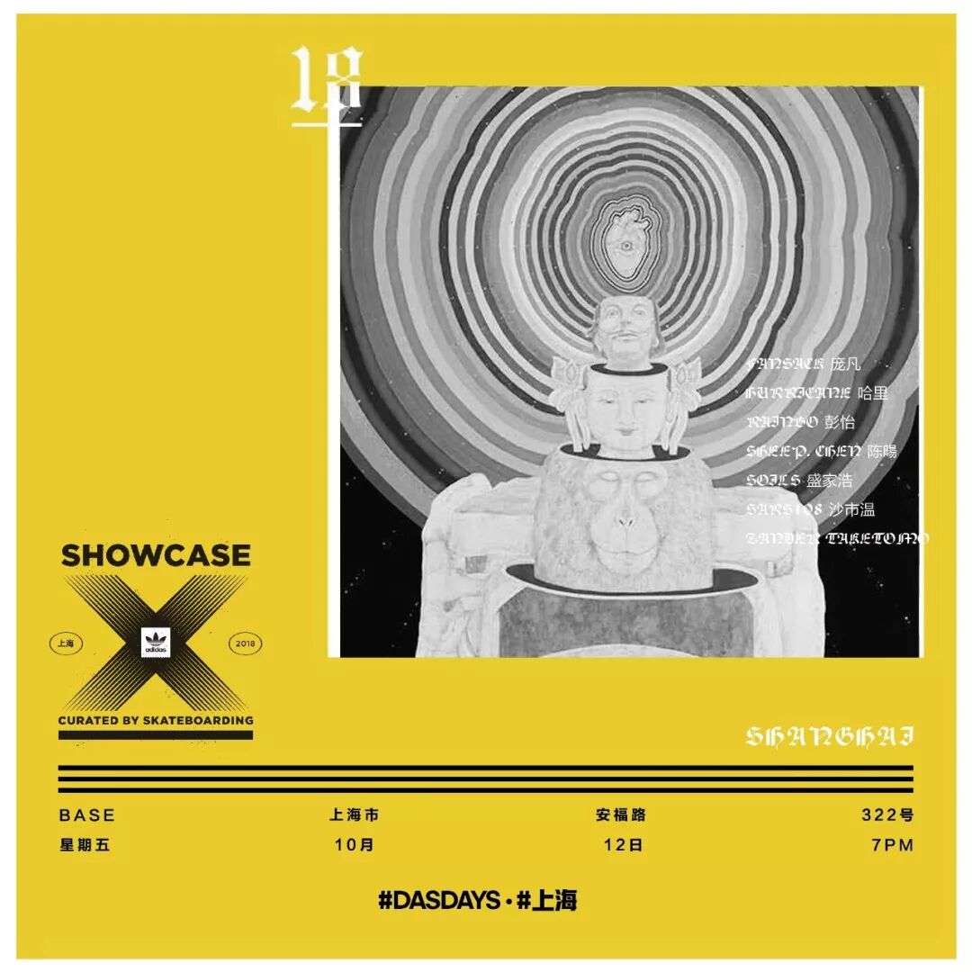 Showcase X作为adidas Skateboarding全球原创艺术家系列的一部分,将于10月12日在社群中心隆重推出。当天活动将围绕着文化及滑板元素呈现联合艺术展览,为滑手社群与潮流新兴艺术家的自发性创作提供一个展示及交流的平台。由潮流艺术家Fansack、Sheep Chen、Hurricane、Soils、Rainbo与Sars等共同策划了Das Days本届上海Showcase X(滑板潮流艺术展)。艺术家们将展示为adidas Das Days创作的精彩作品——著名滑板摄影师Zander Taketomo也将展出近期于上海旅行所拍摄的最新作品,同时来自澳洲,目前常驻于上海的DJ双人组合China Social Club也将奉上现场演出。当晚的最大亮点将是adidas Skateboarding的最新电影全球首映,由常驻上海的adidas签约滑手Brian Peacock主演,Rodrigo TX、Jenn Soto、Lucas Puig及Mariah Duran友情出演。活动开放时间:晚上7点。