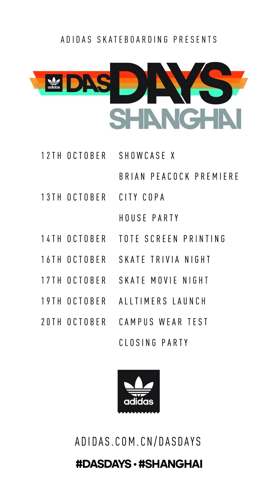Das Days将在上海这座年代悠久的城市举办各项活动,全程安排滑手共同参与Das Days各项体验与创意工坊,并有滑板电影首映、adidas Skateboarding暨Alltimers联名发布会、SHOWCASE X最新一期街头艺术展,以及CITY COPA滑板竞赛。